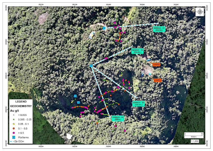 Figure 1. Coritiri Gold Zone showing drill platforms, diamond drill hole traces over the surface rock sampling results