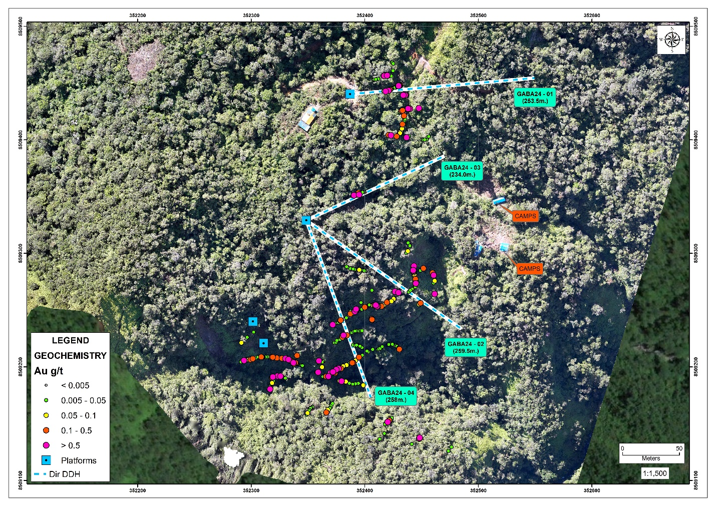 Figure 1. Coritiri Gold Zone showing drill platforms, diamond drill hole traces over the surface rock sampling results