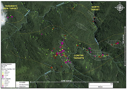 - Three anomalous samples containing as much as 6.95 g/t gold define an emerging new anomalous zone 1.5 km northwest of the main Coritiri anomaly, provisionally named the Yanamayo Target.