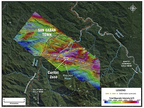 Coritiri was initially identified from interpretation of airborne magnetic data from a survey flown in 2018, which inferred the presence of an 8 km x 1 km NW-SE linear target adjacent to a 6.5 km x 3.0 km northwest southeast trending magnetic high (Figure 2). The geophysical anomaly is coincident with a 5 km long series of gold-in-stream sediment anomalies located within the Yanamayo River catchment (Figure 3). The underlying geology in the area comprises sheared and deformed siltstones and slates with foliation typically striking northwest-southeast and dipping moderately to the southwest.