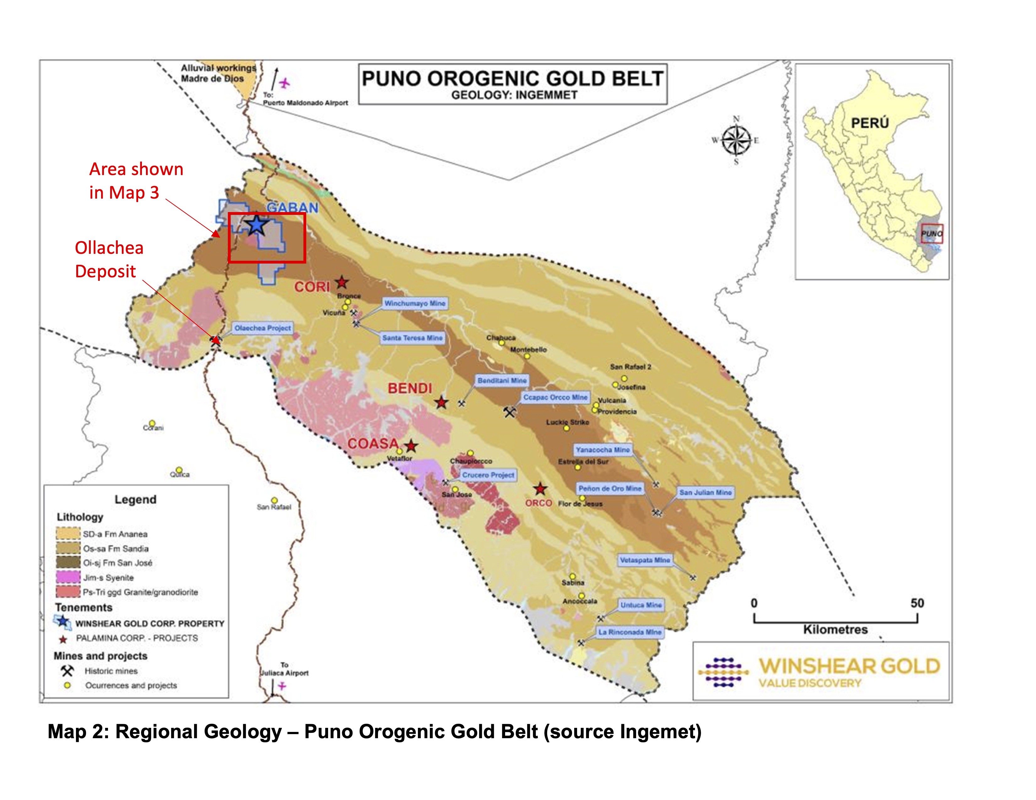 In 2019 Winshear Gold Corp. acquired two exploration projects in Peru from Palamina Corp (TSX-V: PA); the Gaban Gold Project, an orogenic shear zone hosted gold project in the Puno region, SE Peru, and; the Tinka IOCG project near Ica in southern Peru.
