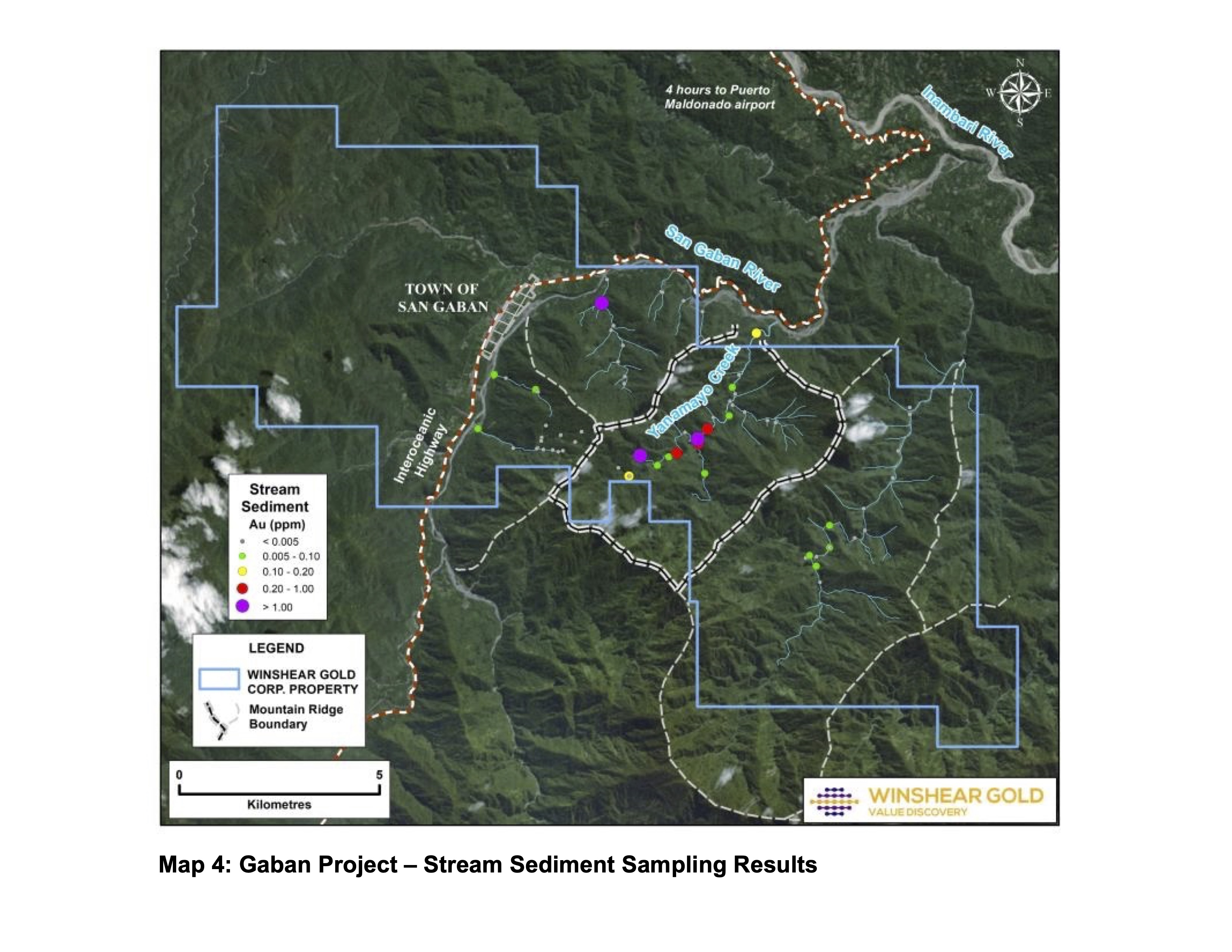 Winshear Gold CEO, Richard Williams, commented “This is a great start to our work at Gaban. The initial attraction of the project was the presence of anomalous gold-in-stream-sediment anomalies over a 5km- section of the Yanamayo creek (Map 4 below) in an area that has had very little historic exploration. These anomalies are located in a geological terrain that is quite similar to the nearby Ollachea Project in the POGB, which contains an estimated 1 million oz of reserves in a definitive feasibility study. It also is upstream from the 700km2 Madre de Dios alluvial gold fields that support several tens of thousands of artisanal miners. The discovery of a 250m wide shear zone hosting gold mineralization at Gaban is very encouraging.”