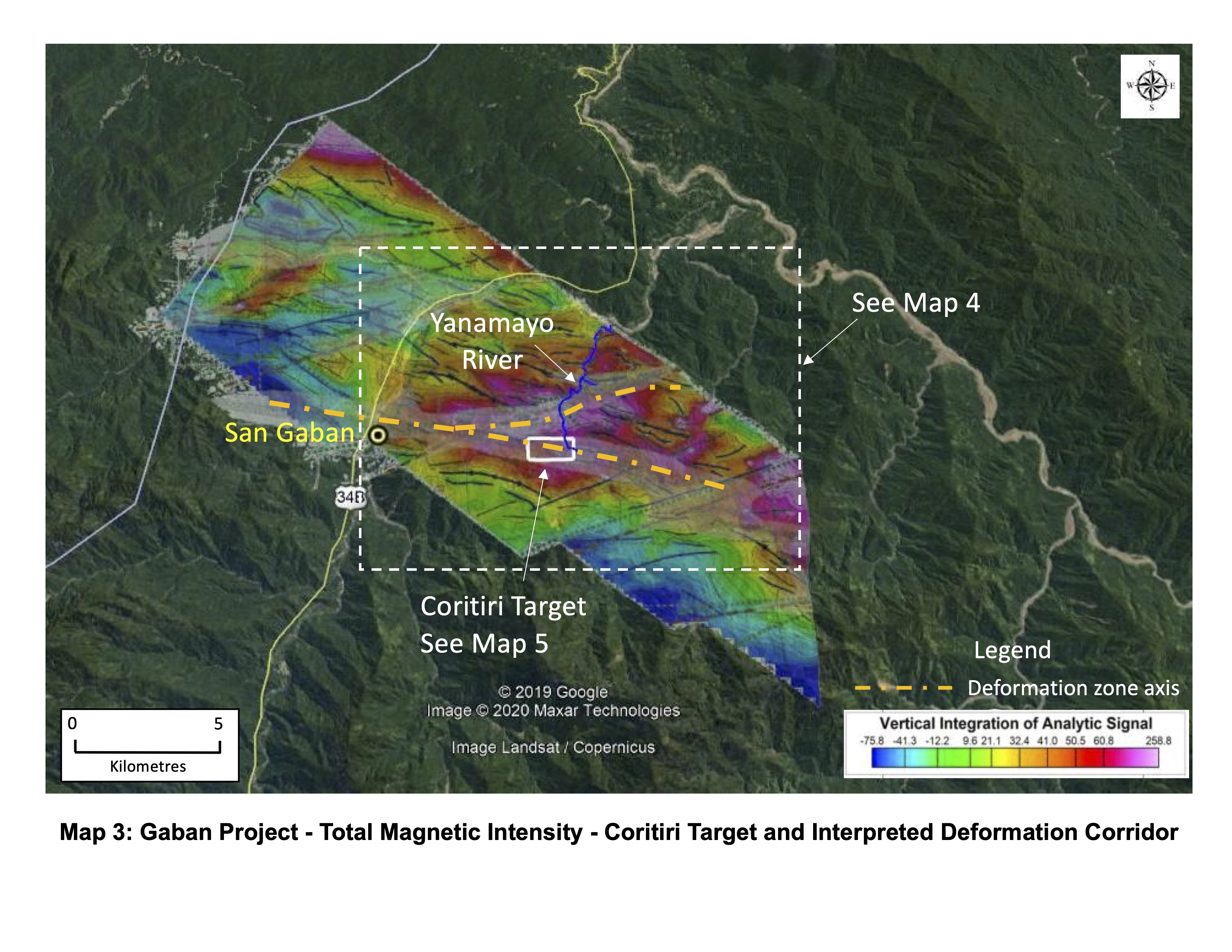Map 4 shows the results of the 2019 stream sediment sampling program with numerous anomalous values obtained along the Yanamayo river as it crosses the geophysical target area.