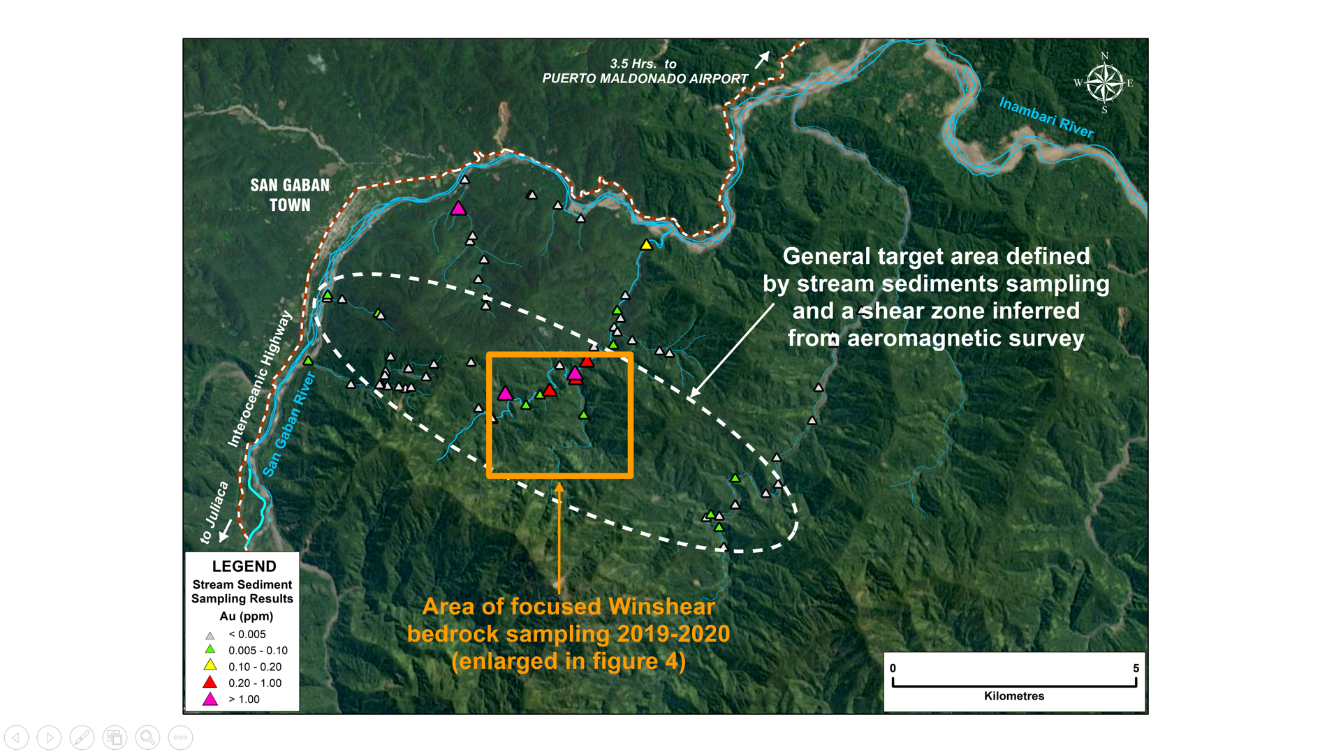 Dr. Mark Sander, President of Winshear, commented: “Three successive mapping and bedrock sampling campaigns totalling 705 samples, beginning in the fourth quarter 2019 and extending to the fourth quarter 2020, have proven that the Gaban project area is a bedrock source of alluvial gold in local drainages and perhaps for the much larger Madre de Dios goldfield downstream to the north.”