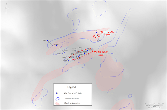 The map below shows the extent of the coincident magnetic / soil geochemical anomalies that define the North and South Zones. The map also shows additional coincident anomalies that have yet to be drill tested.